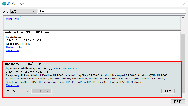 }なお、あらかじめ、RP2040用のボードライブラリもボードマネージャから導入しておきましょう。