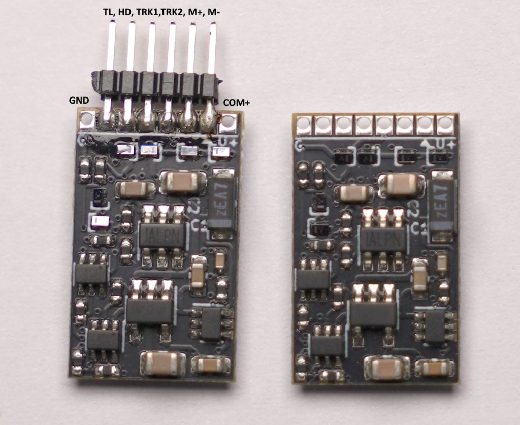 電子部品店などで購入できる、1.27mmピッチのピンヘッダを購入して、6ピンに切り落としてはんだ付けすると、NEM651対応のDCCデコーダとして使用が可能です。
