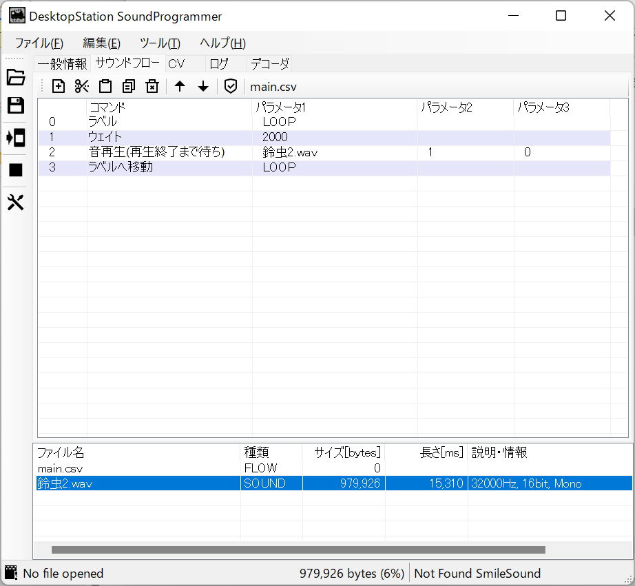 SmileSoundデコーダのサウンドプログラミングは、非常に自由度が高くなるように設計しています。最初は、main.csvが自動で読み出しされて、必要なサウンドフロー(CSV)を呼び出して動かす形となります。ファンクションボタンへの反応も、速度設定によって走り出す音も、全てサウンドフローで記述して実現してます。