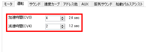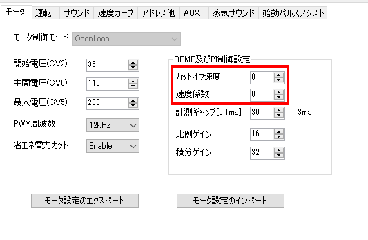 CV54=0,CV10=0にする意味は、主に低速域でBEMFの精度が悪いため、ガクガクする可能性があるのを防ぐためです。また速度制御は人間が行う(スロットル操作)ので、そもそもBEMFの意味があまりないと考えます。CV3=4,CV4=2の意味は、スロットル操作で車両速度が変わるまでの時間をほぼ0秒とするための設定です。0にしてもいいのですが、少し遅延させるほうが滑らかな動きになりますので、このような調整値となります。