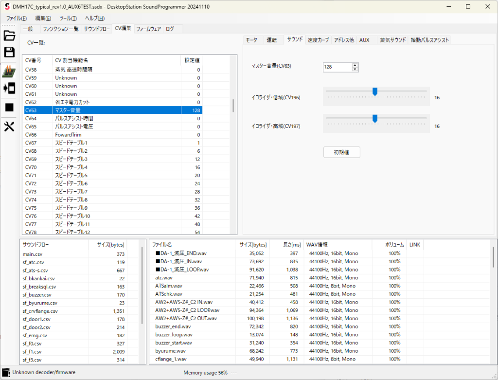 SmileSoundでは、音量はマスター音量(CV63)で全体の音量を調整できます。DSSPでサウンドデータに予め、この音量を設定しておくことができます。サウンドデータ書き込み後は、コマンドステーションのCV書込み機能で調整してください。0が無音、255が最大音量です。SmileSound向けサウンドデータでは、128を目安に設定をしています。
