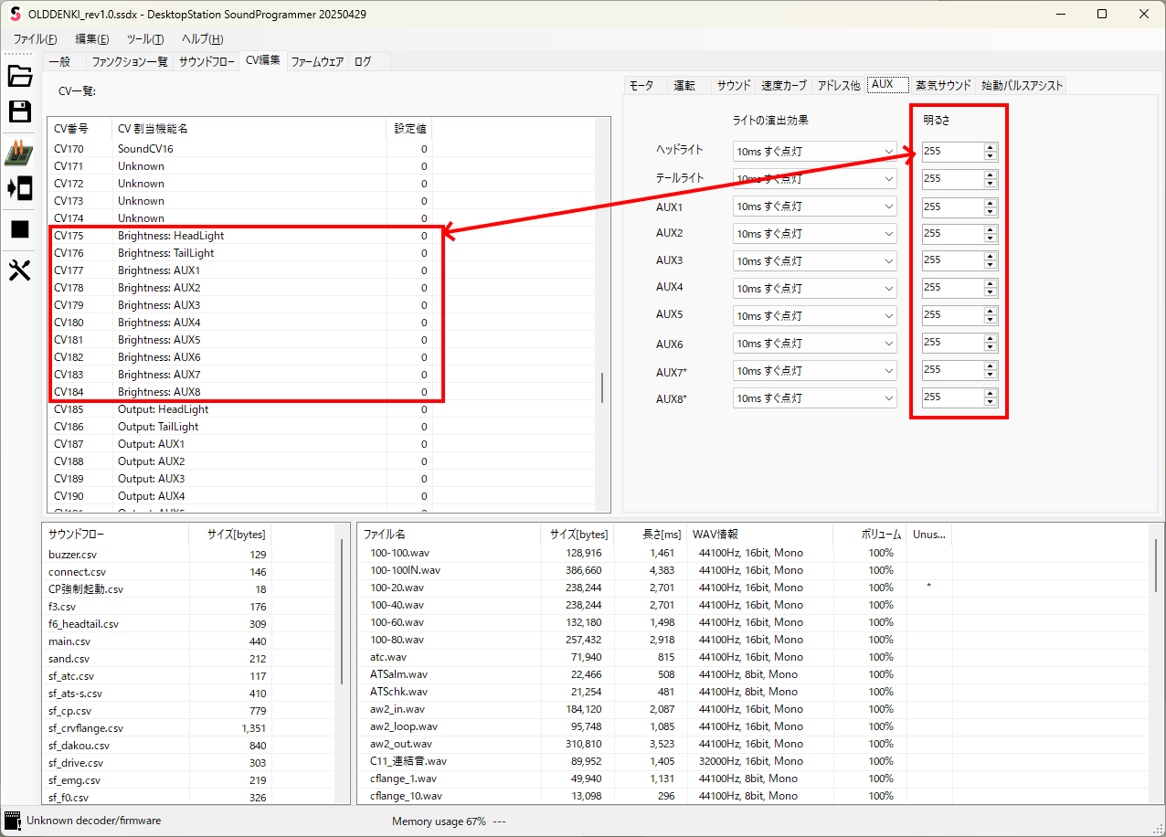 抵抗をどうしても付け替えたくない場合には、SmileSoundの調整機能を使って調整を行っていきます。SmileSoundのAUX出力機能は、全ピンでPWMによる調整が可能です。CV175~CV184が、ヘッドライト・テールライト~AUX8まで割り付けられています。AUXタブでの明るさは0~255で設定でき、255がMax電圧となります。これらの値は結果的にはCVに反映されます。直接、コマンドステーションなどでCVを操作される場合には、CVで設定する値は、255で引いた値が明るさになりますので、お気をつけください。128で50%電圧、0(CVは255)で出力なしになります。