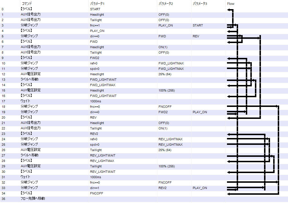SmileSoundのサウンドデータで、停車時に減光を行いたい場合には、f0.csvを以下のサウンドフローに置き換えることで、停車時は減光・走行時は最大点灯に変更できます。